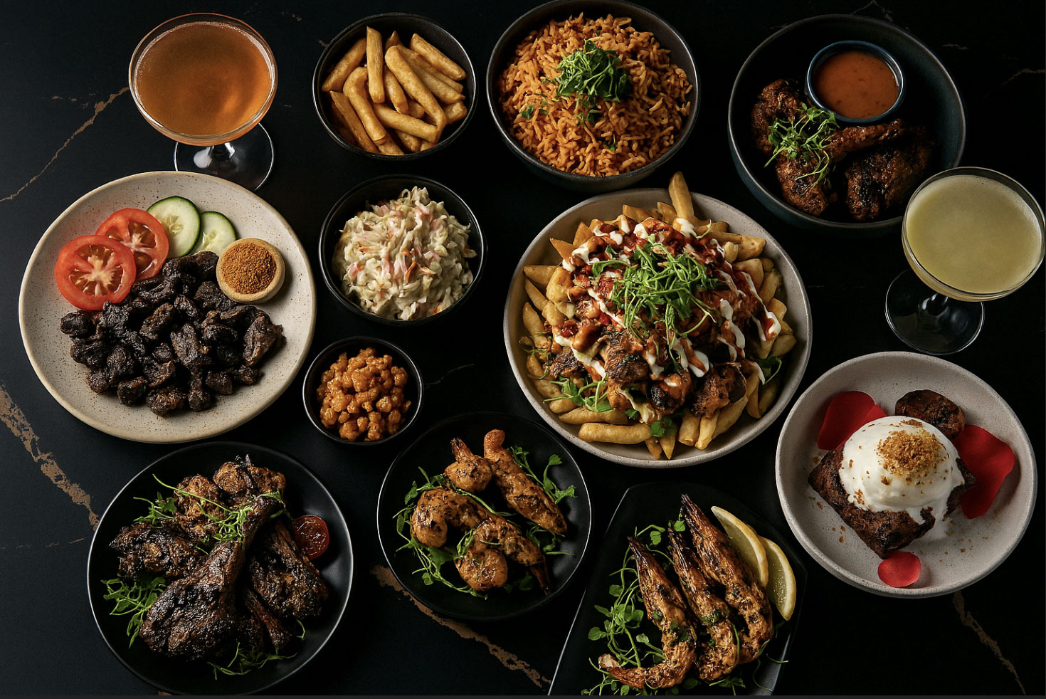 Open-fire Suya grills, jerk heat, craft cocktails and DJs — a premium Afro-Caribbean dining house by day, culture-led nightlife by night.